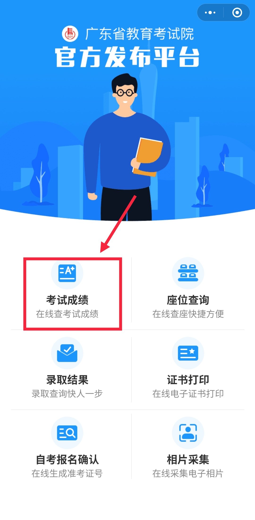 ①在“广东省教育考试院”小程序找到“考试成绩”,如下图: