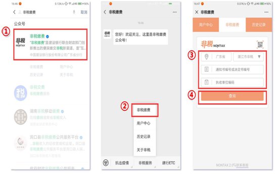 (2)在公众号完成缴费:在微信主页→右上角放大镜→公众号→输入“非税缴费”→进入“非税缴费”公众号→选择“非税服务”→非税缴费→选择“湛江市非税”。在对应位置粘贴“师圈”获取的通知书编号和执收单位编码,点击“查询”后根据提示完成缴费。
