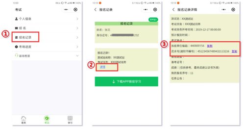 (1)获得“湛江市非税收入缴款通知书”编号和“执收单位编码(440800156)”:在小程序“考试”栏,点击“报名记录”,点击“详情”,复制“湛江市非税收入缴款通知书”编号和“执收单位编码”。