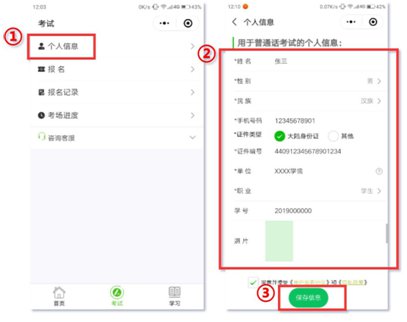 2.填写考生信息:在小程序“考试”栏,点击“个人信息”,填入考生信息(照片属第三方收费,可不上传,考试现场有免费拍照),并点击“保存信息”。