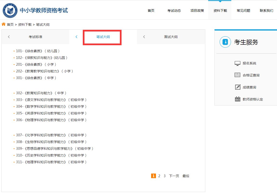 2、进入后,在【笔试大纲】一栏,即可查看各个科目的考试大纲