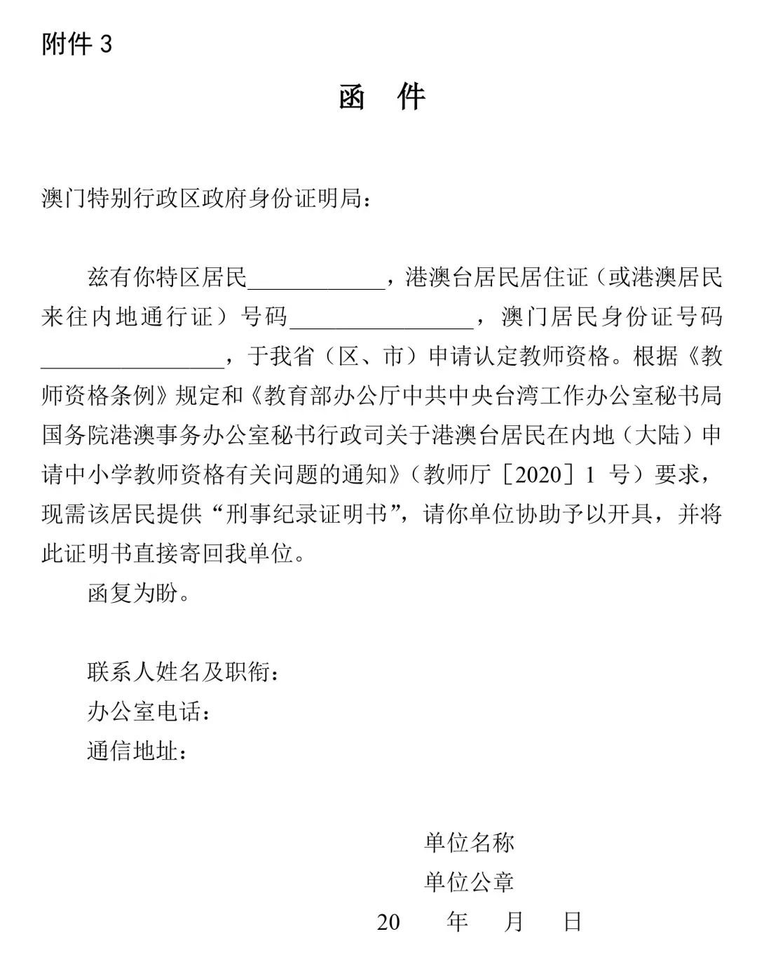 (2)港澳台居民申请认定中小学教师资格需提供无犯罪记录证明。无犯罪记录证明由申请人自行到香港特别行政区、澳门特别行政区和台湾地区的有关部门开具,具体的办理程序请咨询当地相关部门。香港特别行政区、澳门特别行政区申请人开具无犯罪记录证明所需的《无犯罪记录证明函件》,由申请人填写后交给现场确认点,待省级机构填写盖章完毕后,通知申请人到认定机构领取。港澳申请人的有无犯罪情况经港澳相关部门核查后,核查结果会反馈到出具函件的省级机构,省级机构再将核查结论通知有关教育局作为认定依据。台湾地区的申请人的无犯罪证明,由申请人自行到台湾地区相关部门开具,开好的无犯罪证明直接交给申请认定的认定机构。