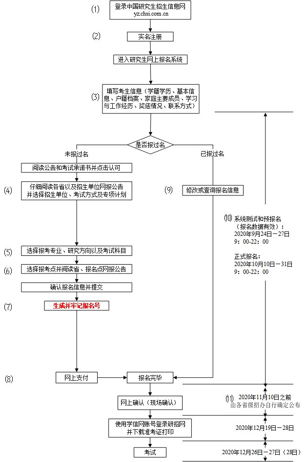 (1)考生应在规定时间登录“中国研究生招生信息网”(网址:https://yz.chsi.com.cn)浏览报考须知,并按教育部、省级教育招生考试机构、报考点以及报考招生单位的网上公告要求报名;