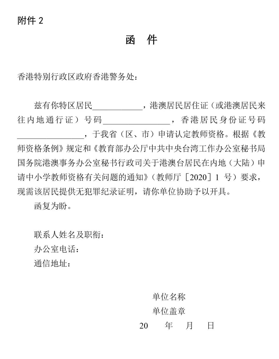 (2)港澳台居民申请认定中小学教师资格需提供无犯罪记录证明。无犯罪记录证明由申请人自行到香港特别行政区、澳门特别行政区和台湾地区的有关部门开具,具体的办理程序请咨询当地相关部门。香港特别行政区、澳门特别行政区申请人开具无犯罪记录证明所需的《无犯罪记录证明函件》,由申请人填写后交给现场确认点,待省级机构填写盖章完毕后,通知申请人到认定机构领取。港澳申请人的有无犯罪情况经港澳相关部门核查后,核查结果会反馈到出具函件的省级机构,省级机构再将核查结论通知有关教育局作为认定依据。台湾地区的申请人的无犯罪证明,由申请人自行到台湾地区相关部门开具,开好的无犯罪证明直接交给申请认定的认定机构。