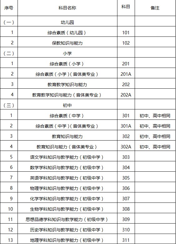 7.音、体、美专业考生的笔试公共科目一、科目二(科目代码:201、202、301、302)实行单独编码(相应科目代码:201A、202A、301A、302A),音、体、美专业考生在笔试报名时应选报单独编码的公共科目。取得科目201A、202A合格的考生,面试仅限于参加小学类别音、体、美专业科目;取得科目301A、302A合格的考生,面试仅限于参加初中、高中、中职类别音、体、美专业科目。考生已获得科目201、202、301、302合格成绩,可相应替代科目201A、202A、301A、302A合格成绩;考生已获得科目201A、202A、301A、302A合格成绩不可替代科目201、202、301、302合格成绩。
