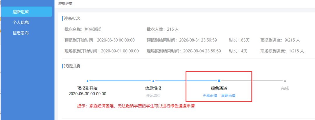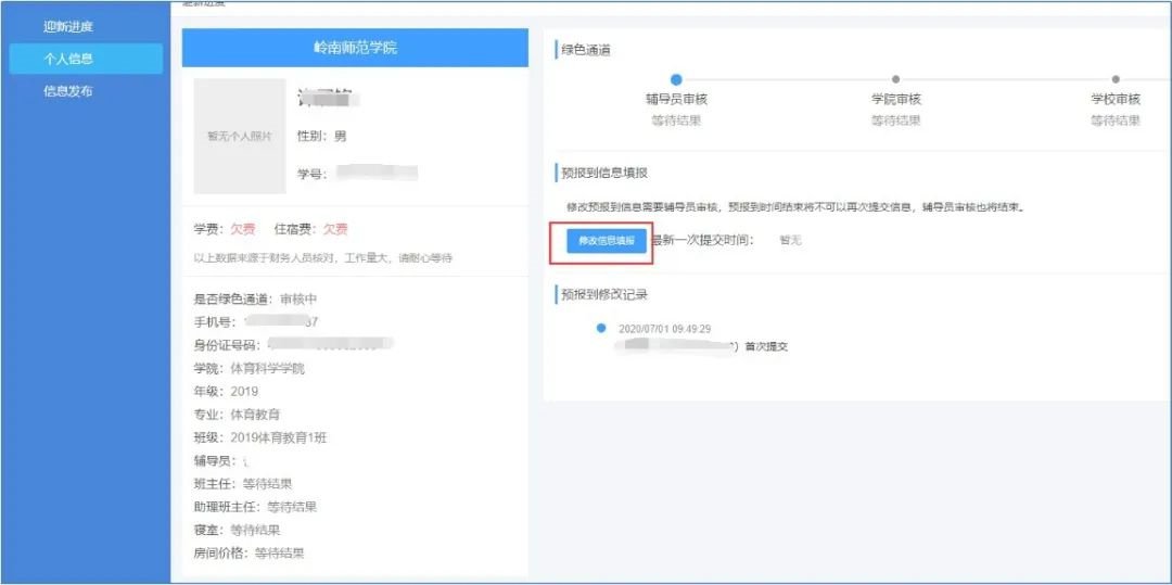 6.填写完成预报信息的同学可以在个人信息界面绿色通道审核进度、自己的学号、班级、辅导员、助理班主任等信息。在可修改时间内,可点击修改信息填报进行再次修改。
