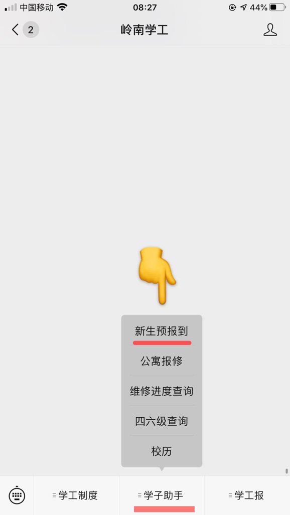 2.关注岭南学工公众号后点击“学子助手”菜单栏,选择“新生预报到”即可进入新生预报到登录页面。