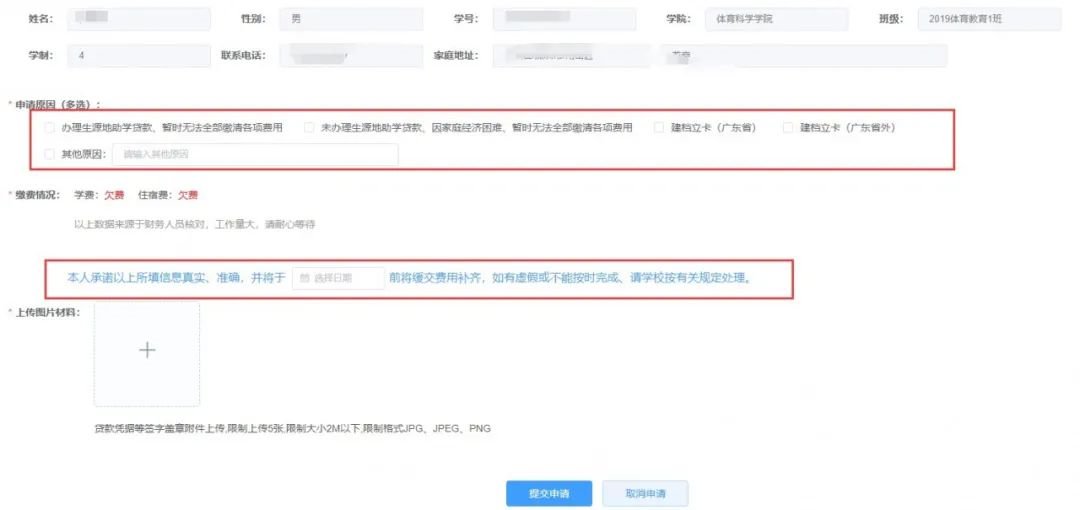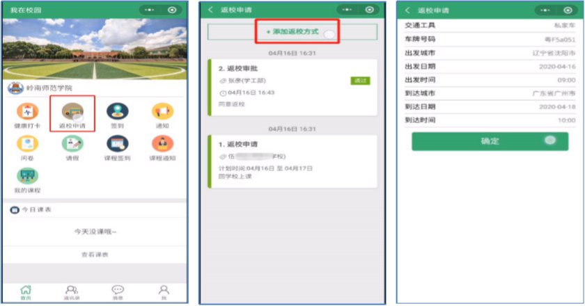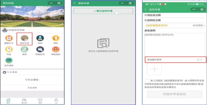 1.提交返校申请。上传附件:本人当天粤康码、行程卡、录取通知书(中高风险地区还需上传本人最近 3 天内的核酸检测阴性报告)等证明材料。