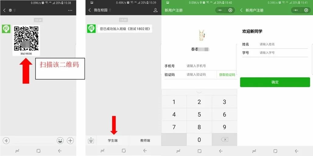2.收到辅导员老师发来的班级二维码,点击二维码图片并识别二维码;进入公众号后会收到加入班级的提示,点击下方“学生端”进行注册;输入手机号,填写验证码;输入姓名和学号。