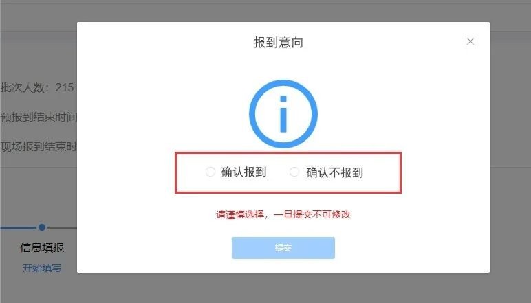 5.登录系统后会出现报到意向选择框,根据自己的实际意向选择报到意向:确认报到/确认不报到。