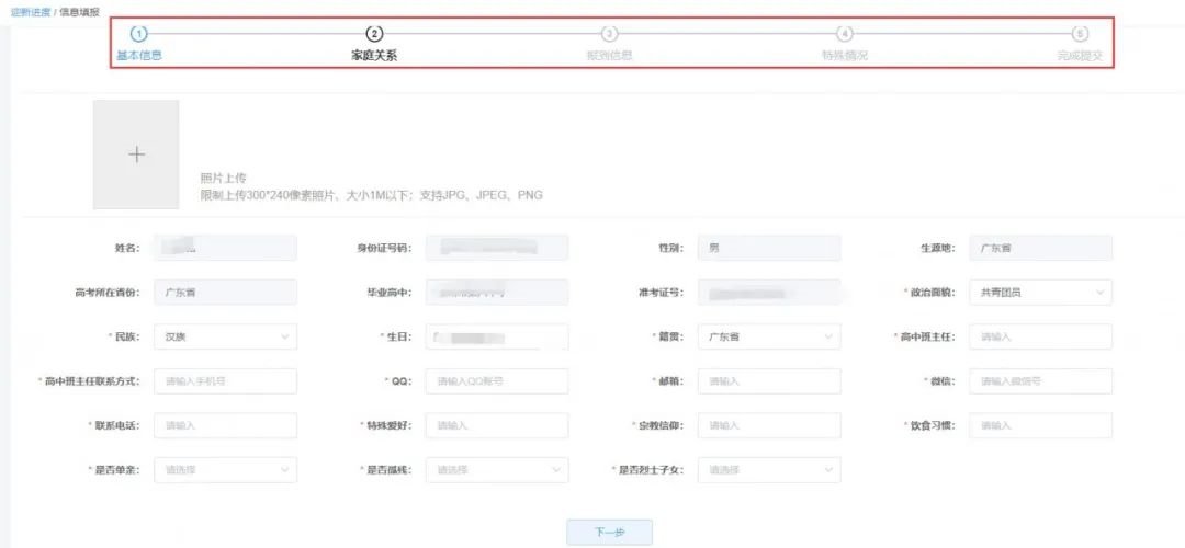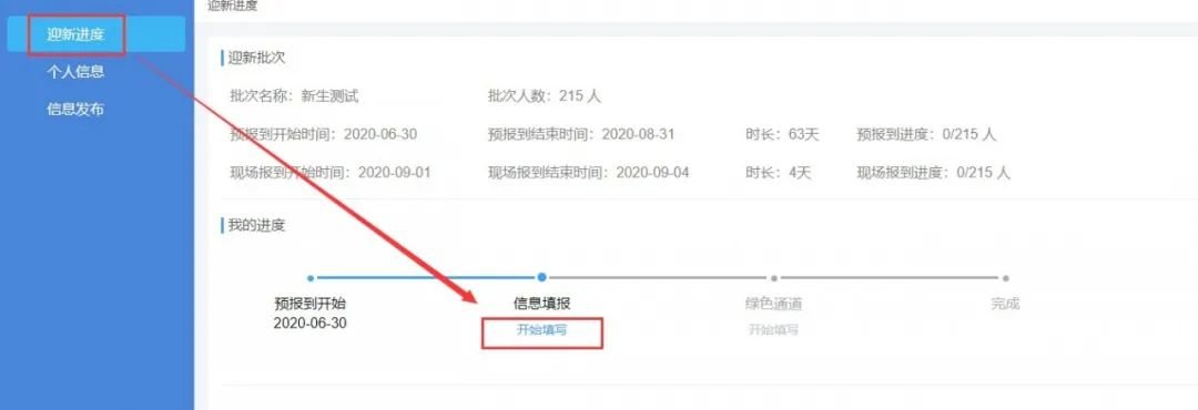 选择确认报到的同学,可以进入系统进行预报到信息的填写,点击信息填报的开始填写按钮,弹出信息填写界面,按照信息填报步骤将每个步骤信息如实填写完整,提交完成预报到信息填写。