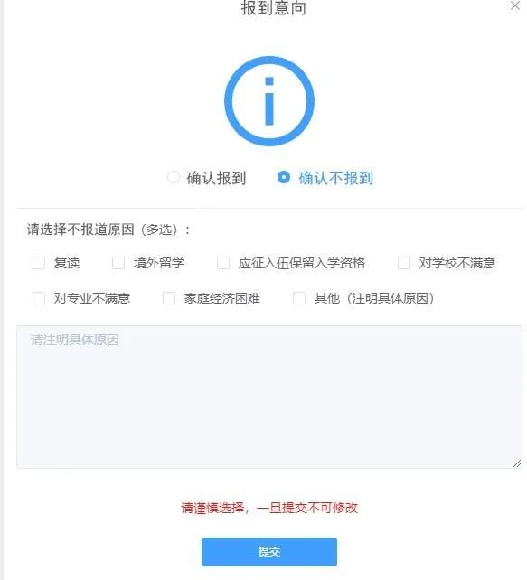 选择确认不报到的同学,需勾选不报到原因,勾选其他要注明具体原因;