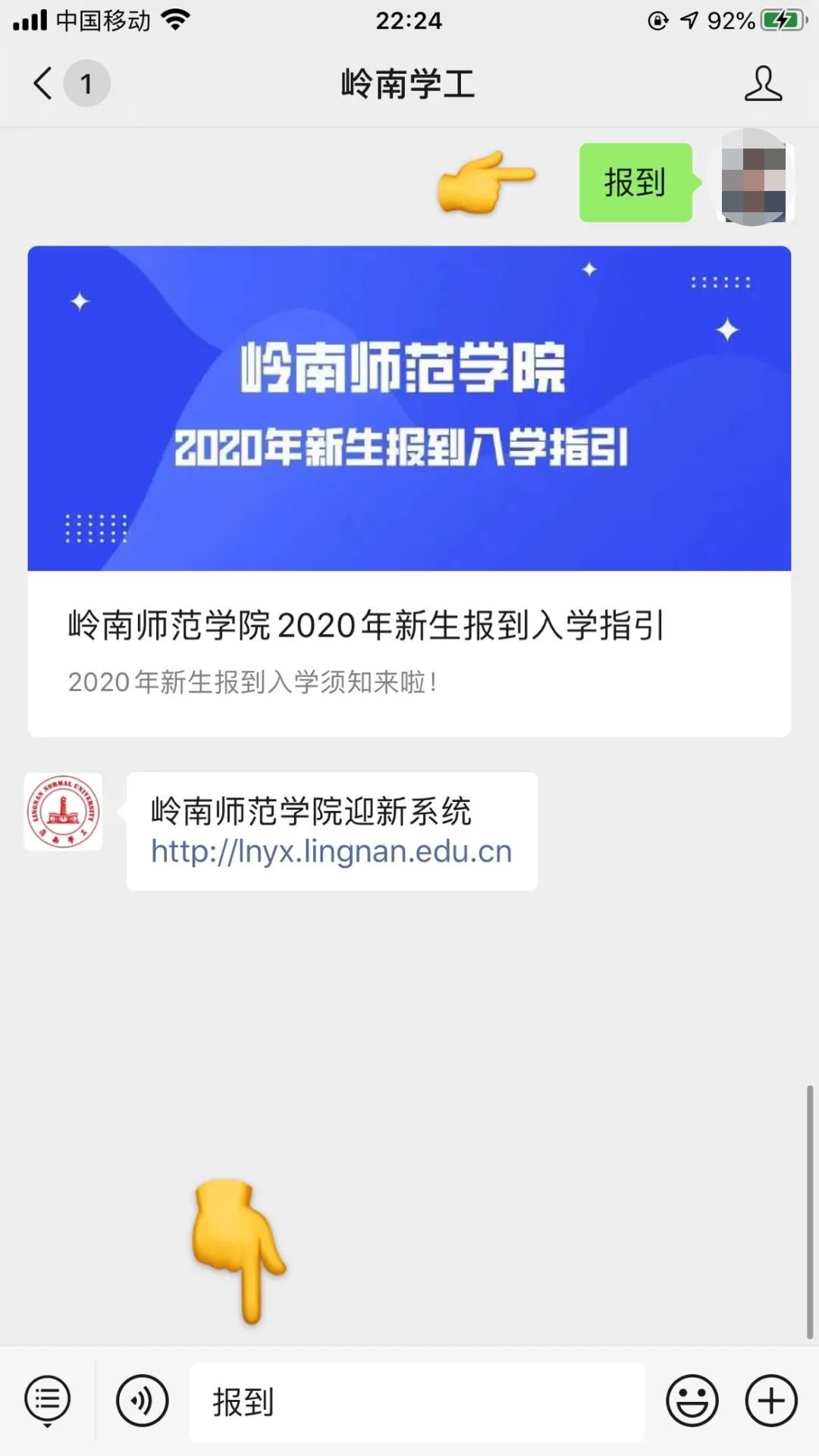 3.或者向岭南学工公众号发送信息:报到,即可收到岭南师范学院迎新系统网址以及新生报到入学相关指引的推文。