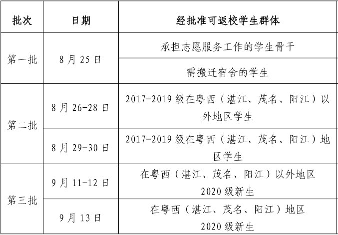 结合学校实际,岭南示范学院制订了2020年秋季学期学生返校工作方案。方案对学生返校时间做出如下安排:
