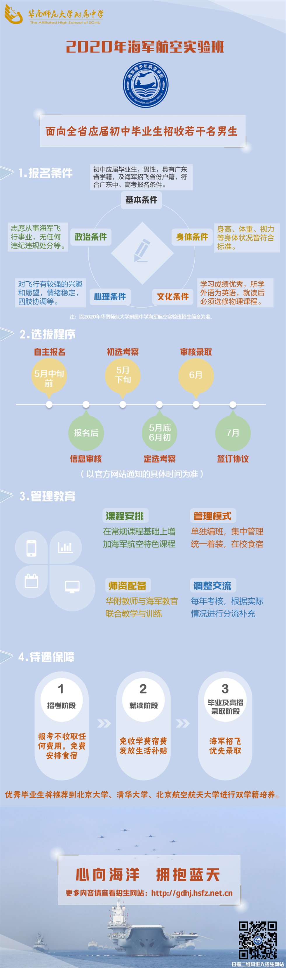 为探索建立军地合作、超前培育、精确高效招飞培养新模式,超前储备热爱海空、适合飞行、素质全面的精英人才,为将来遴选舰载机飞行员提供有力支撑,经海军、教育部和广东省教育厅批准,由华南师范大学附属中学承办广东省海军航空实验班,自2019年起面向全省招收初中毕业生。