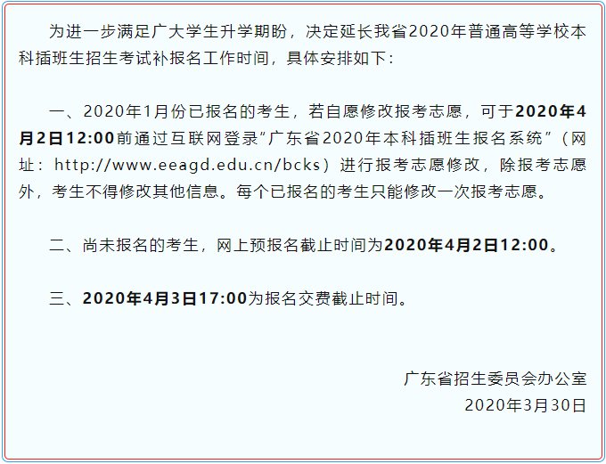 考生可于2020年4月2日12:00前通过互联网登录“广东省2020年本科插班生报名系统。