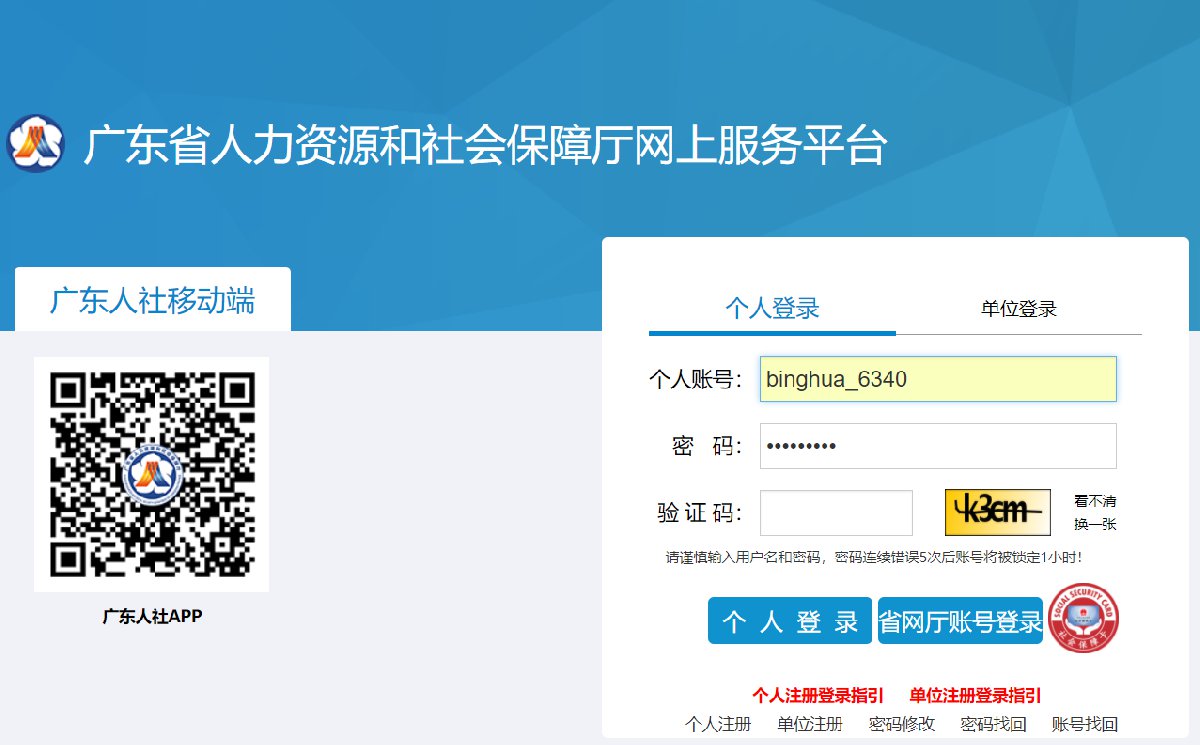 在系统入口点击登录按钮进入广东省人力资源和社会保障厅网上服务平台的个人登录界面,输入正确的账号、密码和验证码后即可登录。