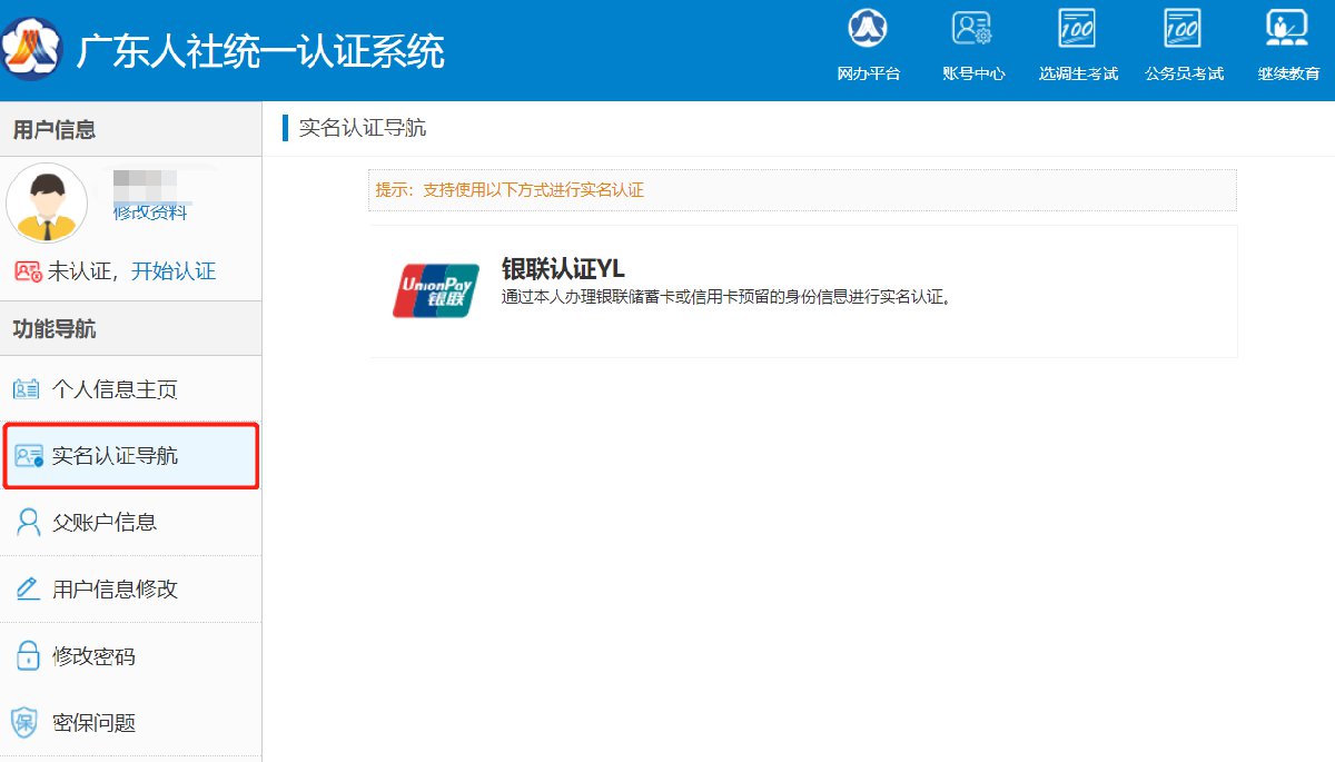 在账号中心界面的实名认证导航栏目,点击银联认证YL按钮,输入名下的银联卡号、银联卡对应的手机号码,通过短信验证后,即可完成实名认证。实名认证后的用户,方可使用电子证书系统。