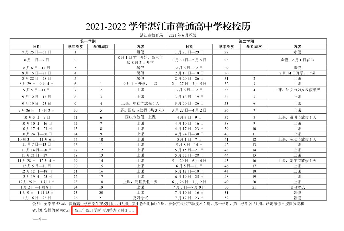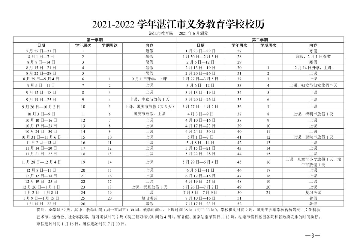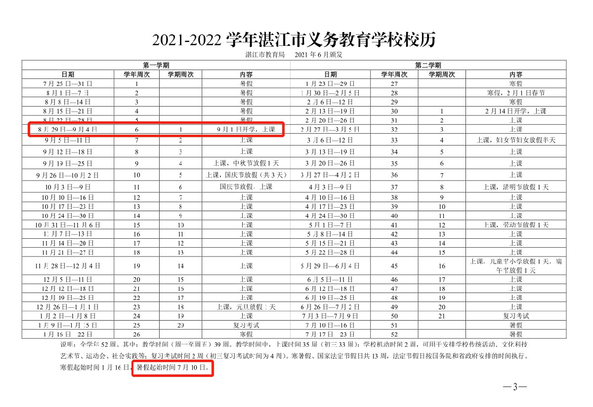 2021-2022学年湛江中小学放假时间安排表如下: