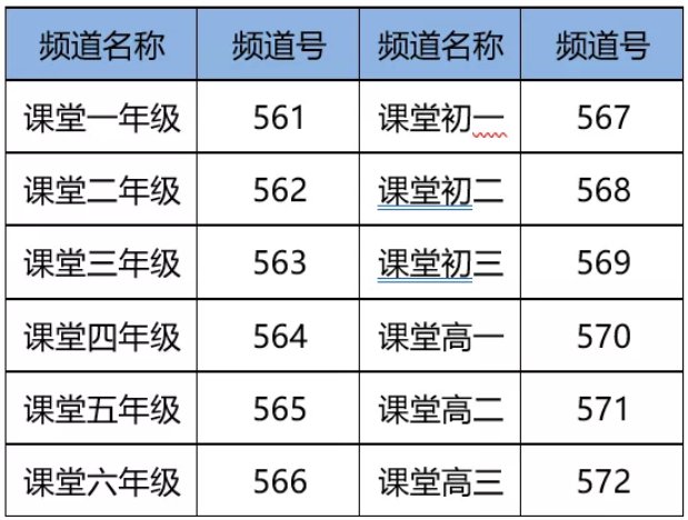 “粤课堂”各年级课程内容均在天翼高清(IPTV)上由指定频道播出,分别对应中小学各年级的课程内容,频道号如下: