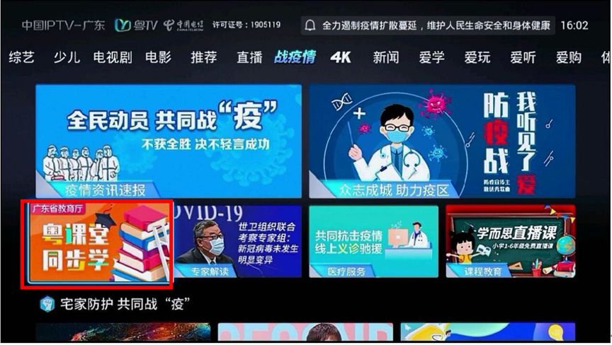 操作步骤:打开天翼高清(IPTV)进入首页,右移至“战疫情”,选择“粤课堂”即可进入粤课堂课程专区观看点播内容。