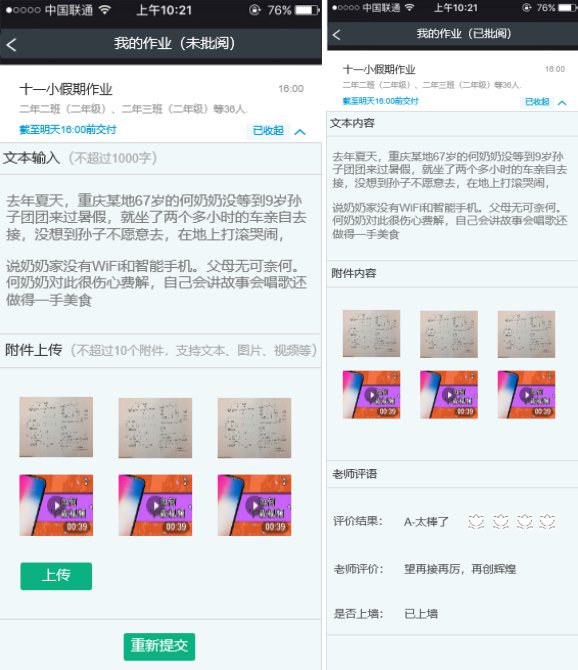 ❷点击我的作业,当教师已批阅时,则不允许学生进行修改并重新提交,点击查看作业,进入作业详情页,展示作业内容和教师评语相关信息;