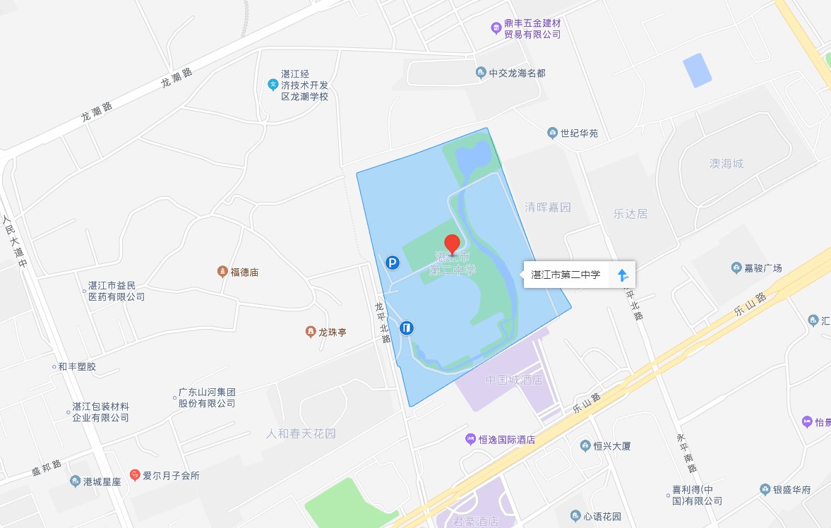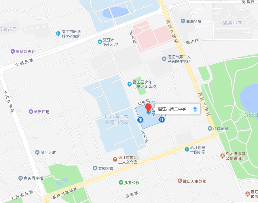 1.湛江市第二中学开发区校区:湛江市经济技术开发区龙平北路