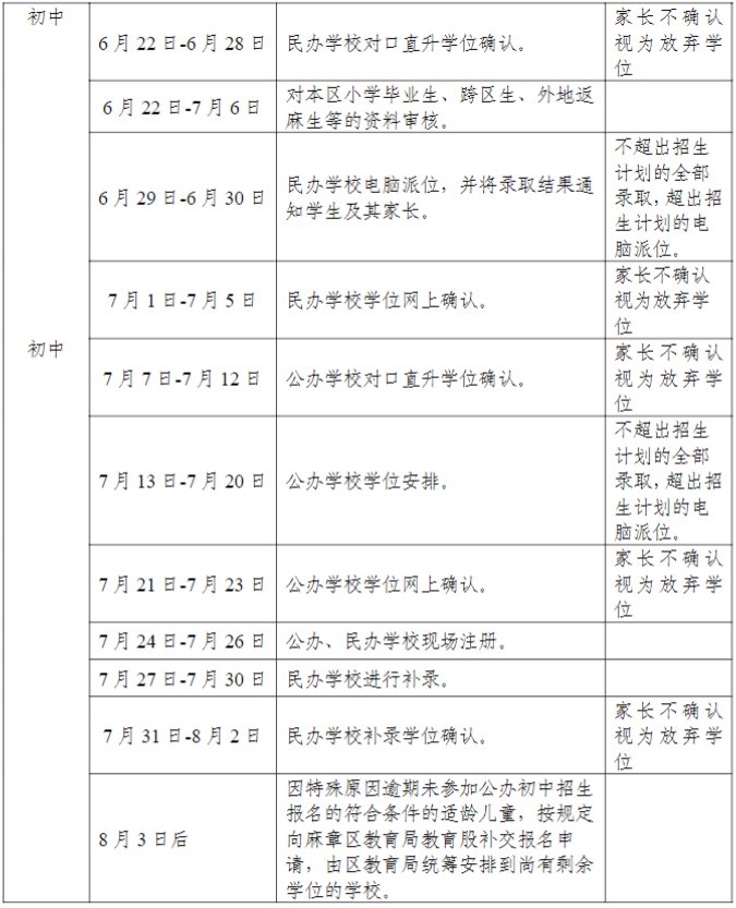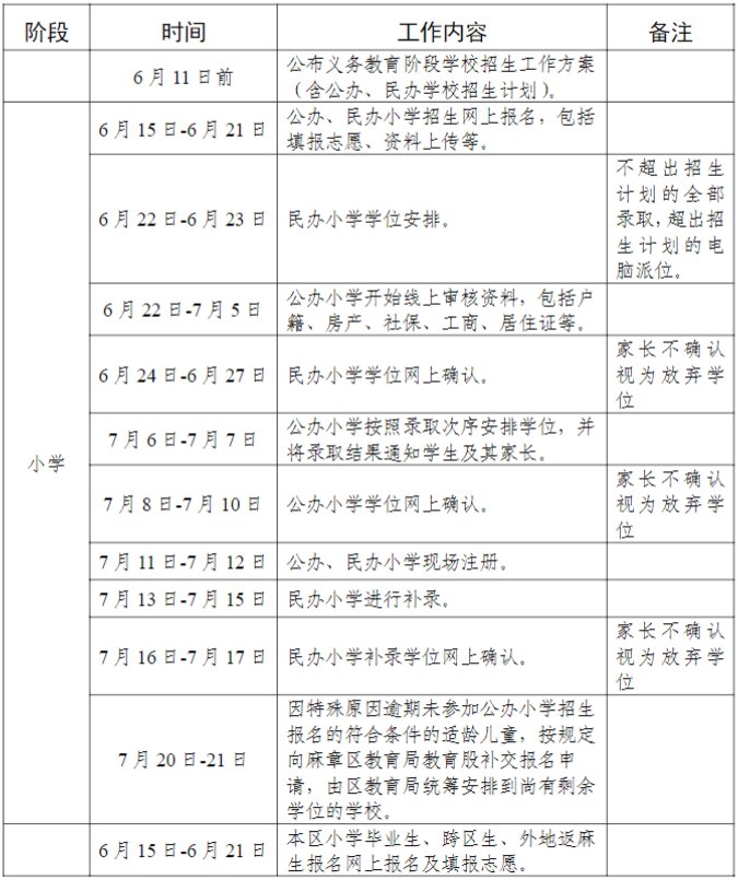 麻章区义务教育阶段学校招生入学工作日程安排(2020年)