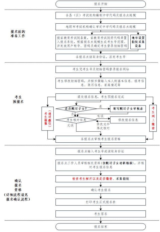 各市县招生考试机构和报名点工作人员,根据考生网上预报名所填信息和上传的资格审核材料进行网上资格审核工作。审核结果将通过报名系统反馈给考生。审核结果分为通过、不通过和待验证。审核结果为通过的,可确认考生报名资格;审核结果为不通过的,审核人员必须通过系统或电话明确告知考生不通过的原因,考生可根据反馈的不通过原因,修改或补充相关报名信息及审核材料后,再次提交审核;考生上传的资格审核材料基本可判定符合我省报考条件,但还须复核原件材料的,审核结果设置为待验证,可先确认考生报名资格,待后期复核考生原件材料。