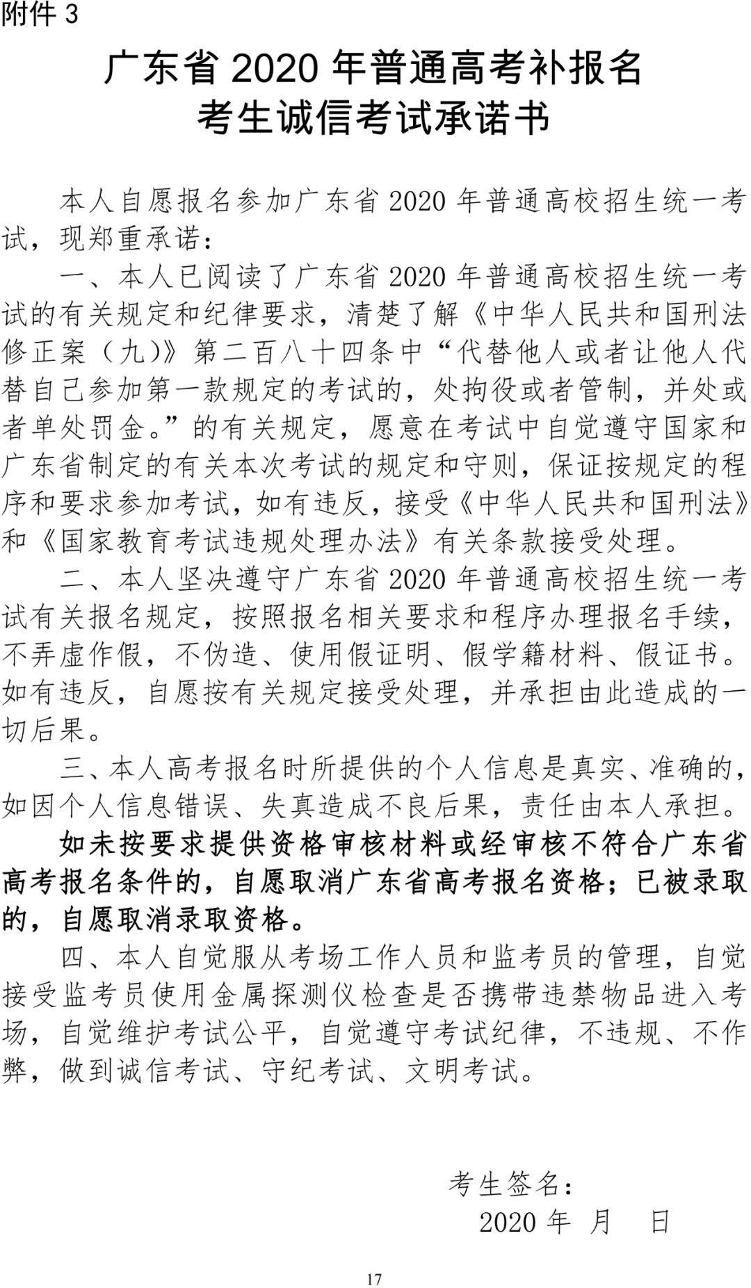 3.广东省2020年普通高考补报名考生诚信考试承诺书