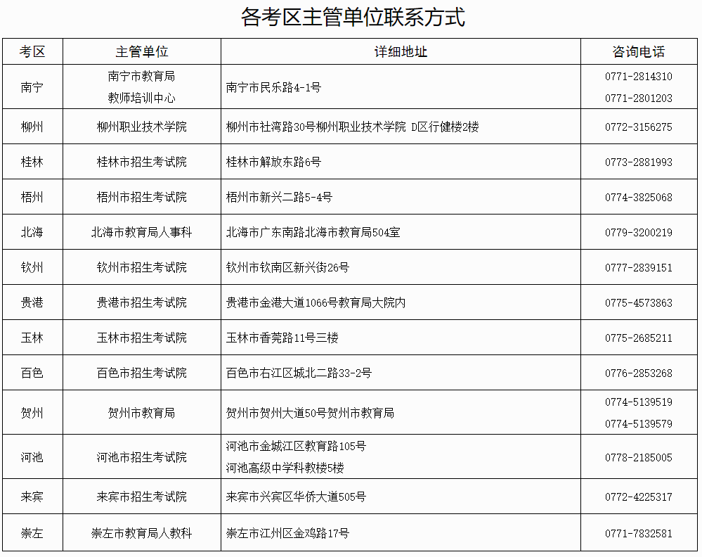 (二)有关此次考试的信息将在“广西招生考试院”网站、“柳园清风”微信公众号上发布,请考生密切关注。其他未尽事宜,可联系各考区主管单位咨询。