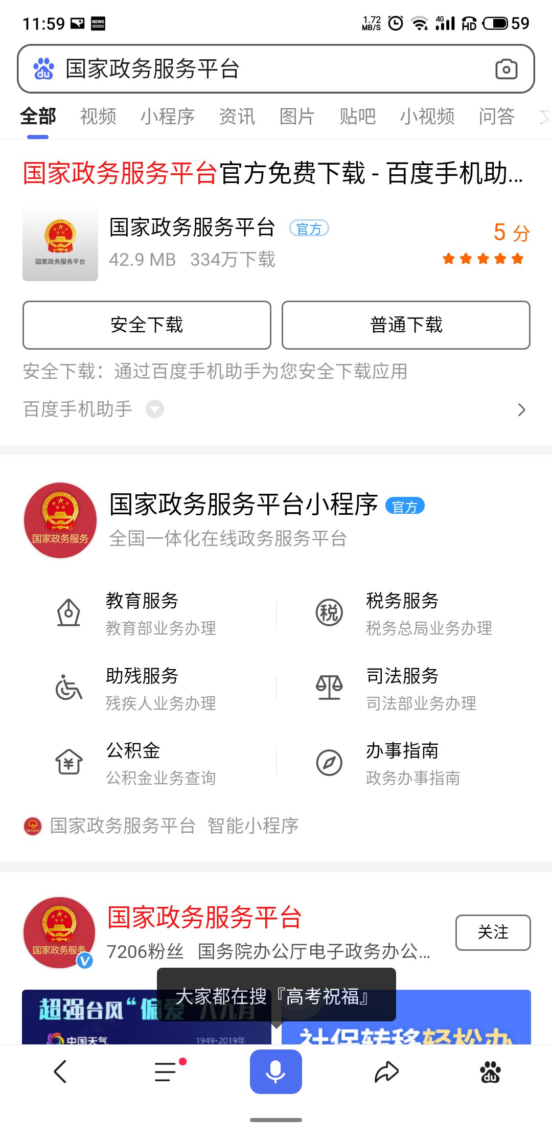 第一步:进入百度,搜索国家政务服务平台小程序,进入小程序,找到教育服务,点击『更多』