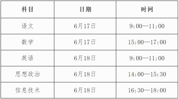 本次开考科目:语文、数学、英语、思想政治、信息技术。考试方式均为笔试,实行试卷和答题卡分离模式。考试时间安排如下: