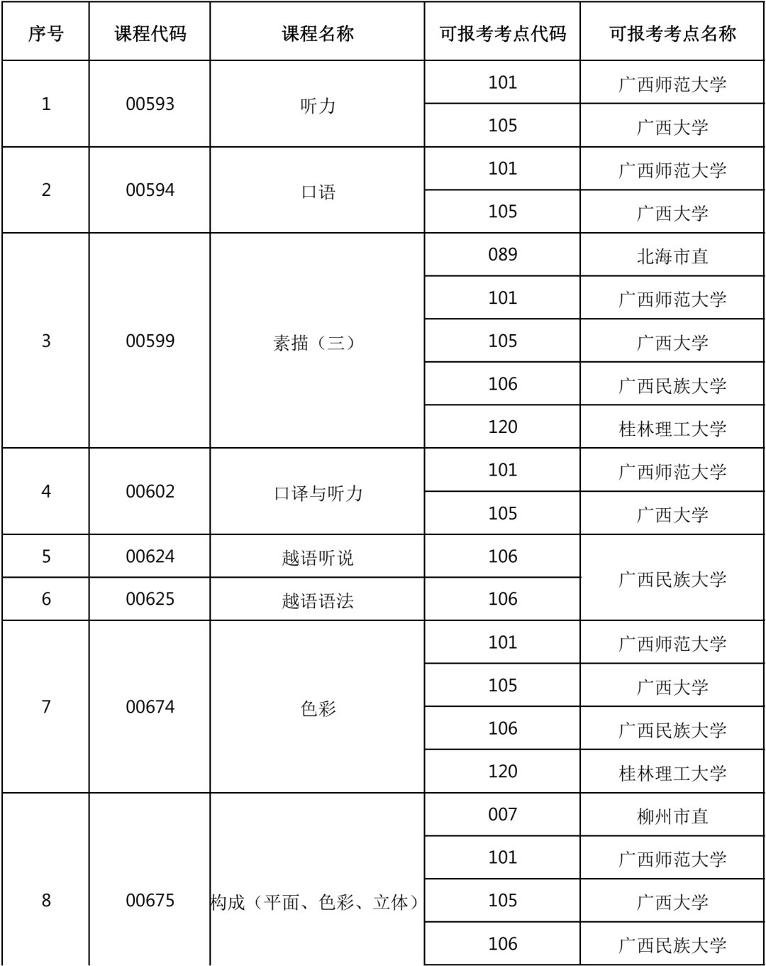 本次考试全区14个设区市均安排有考点,社会考生可选择市直考点作为考试地点,专本衔接考生、网络助学考生、助学班考生可选择市直或高校考点作为考试地点。在本次考试报考结束前,考生可登录“广西自学考试网上系统”更换考试地点,报考结束后不允许再更换考试地点。绘画类、制图类、面试类等特殊课程考试地点由我院统筹安排(附件2)。