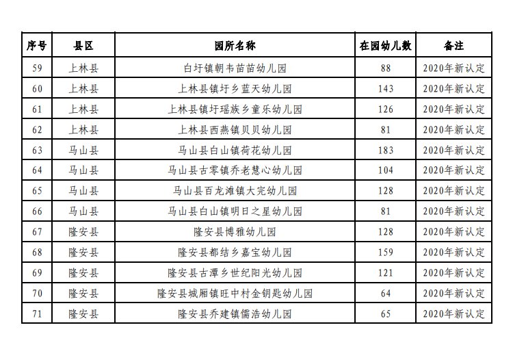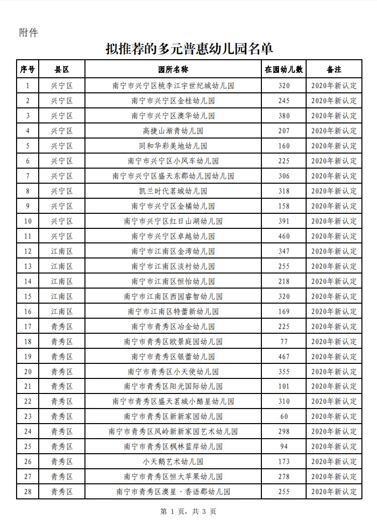南宁市教育局关于推荐南宁市兴宁区桃李江宇世纪城幼儿园等71所幼儿园参加自治区教育厅多元普惠幼儿园审核认定的公示