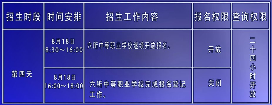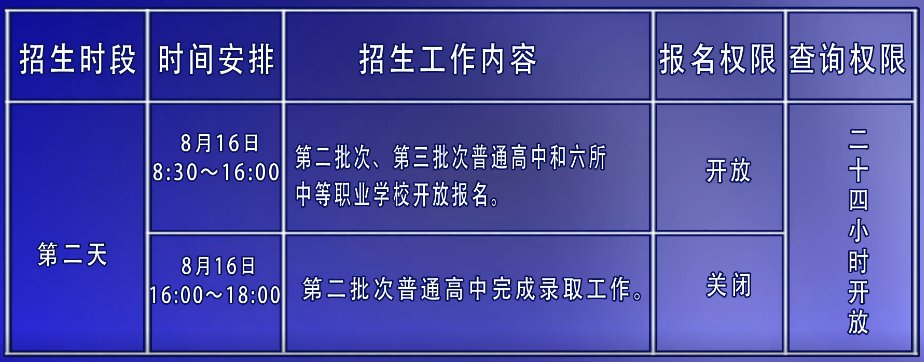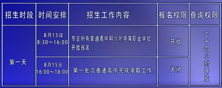 市区高中阶段学校统一招生工作在8月15日至18日进行,其中普通高中招生在8月15日至17日三天时间内进行,在录取时间内各校的指令性(含定向生和非定向生)和指导性招生计划同时完成。中等职业学校招生工作与普通高中招生工作同步开始,8月18日完成网上报名登记工作。