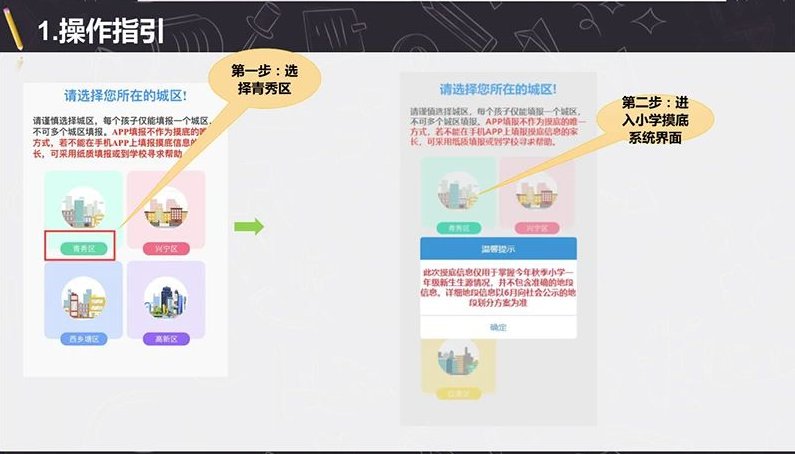 下载爱南宁APP,注册登录后,点击“更多应用”到“智慧教育”,再点击“小学生摸底”并选择“青秀区”,根据提示填报信息。结合家庭实际情况,选择“原有楼盘新生摸底填报”、“2020年新增楼盘新生摸底填报”、“2020 年拆迁小区新生摸底填报”其中一个模块填报。