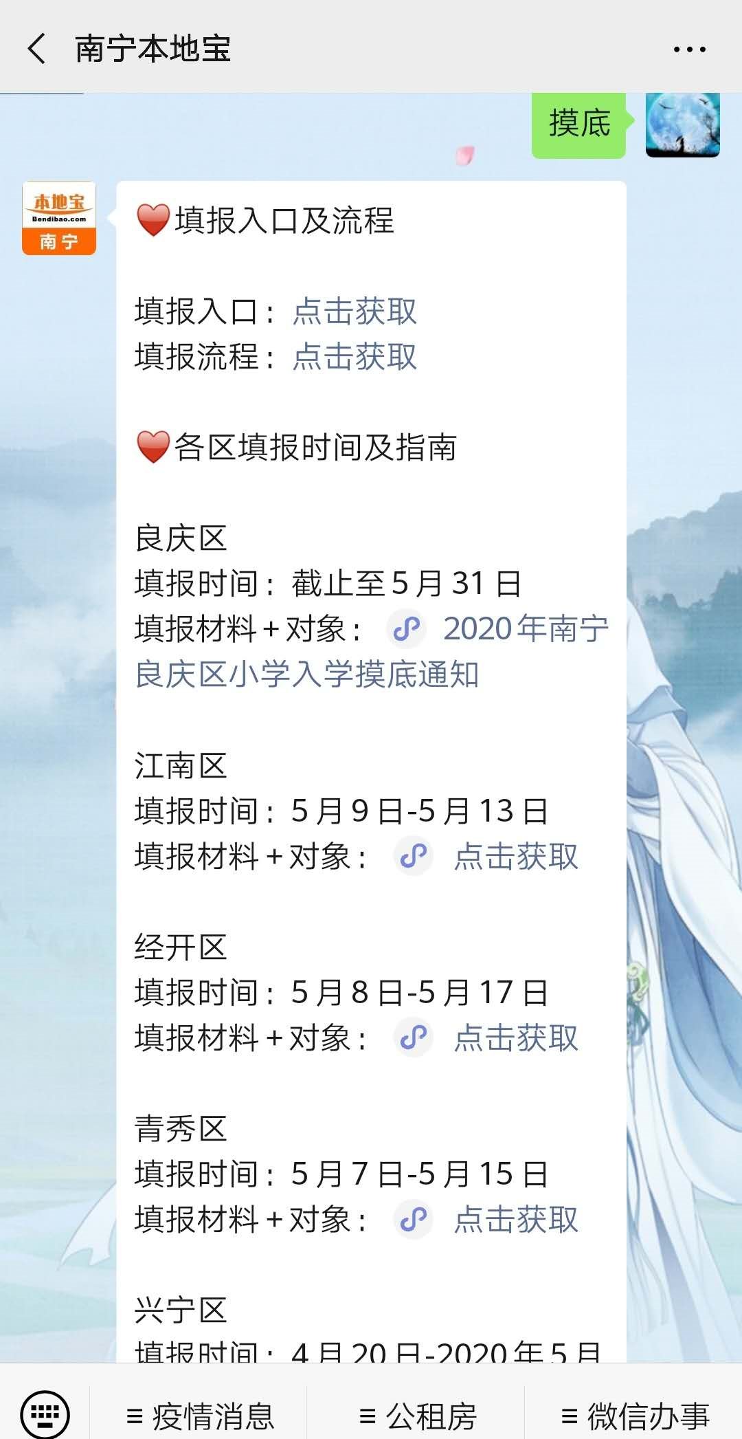 温馨提示:可在南宁本地宝微信号对话框回复【摸底】可以查看南宁良庆区小学入学摸底登记办理入口、登记办理流程等信息~回复【小学】、【初中】即可查看南宁各城区幼升小/小升初划片汇总、南宁各区的招生简章、报名方式及入口等~回复【校服】可以查看南宁中小学正版校服购买地址及网址哟!