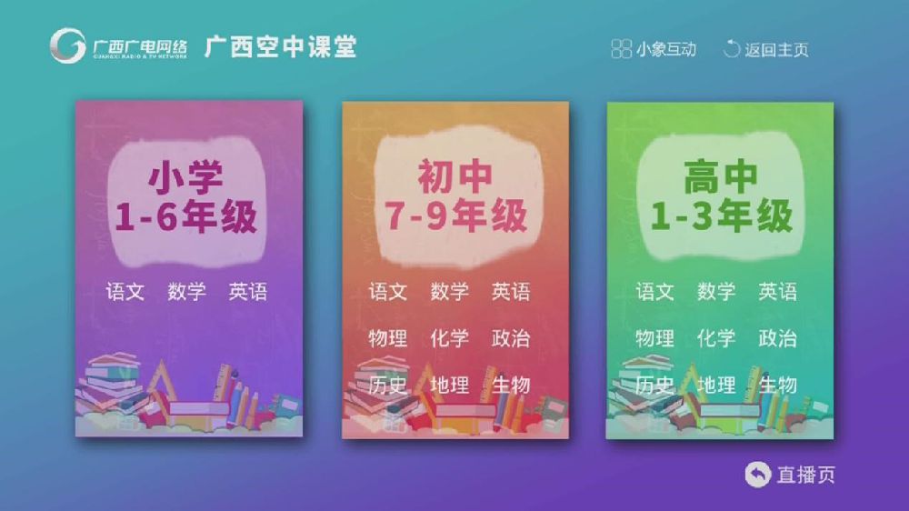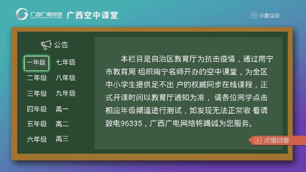 将焦点向右移动到空中课堂处按遥控器“确定”键,进入到广西空中课堂页面,在该页面可以选择相应的内容,如通过遥控器的方向键移动焦点到一年级并按“确定”键,即可收看一年级的内容,如下图所示: