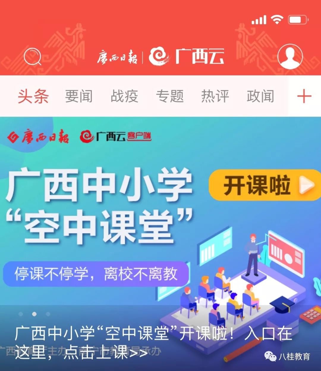 微信搜索并关注“广西电信”公众号,选择“我要办理”——“光纤电视”——“空中课堂”即可收看。