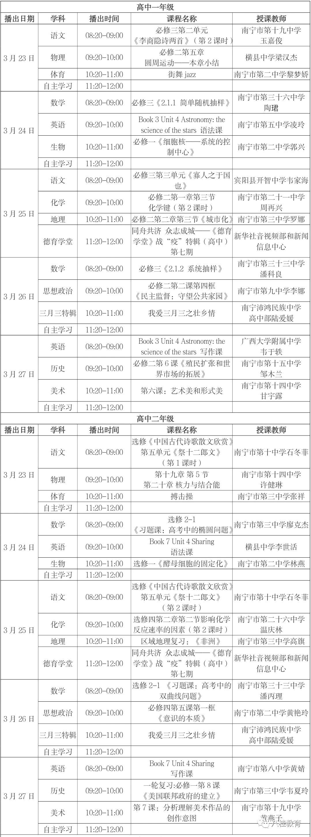 广西中小学“空中课堂”优秀课例播出课程表——高中