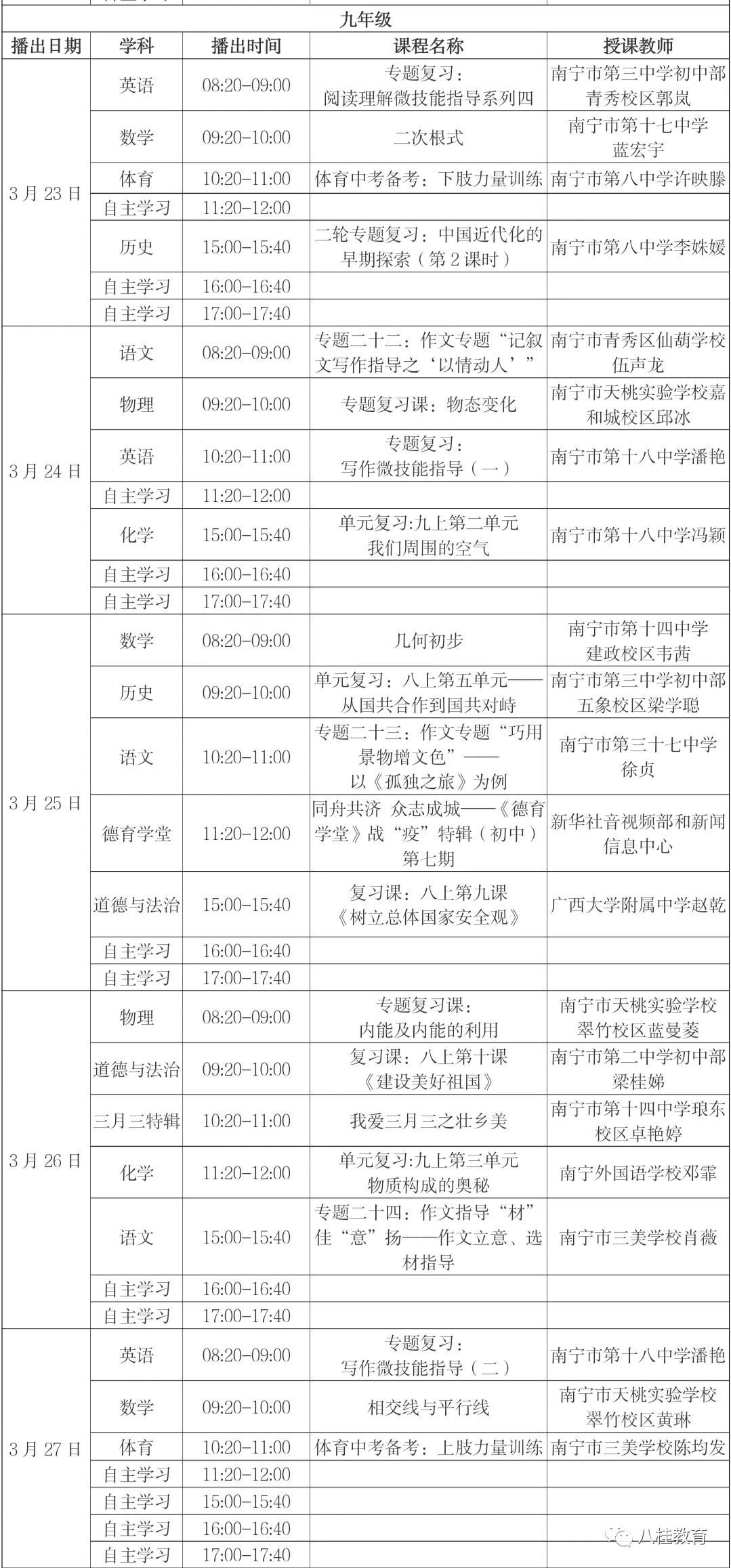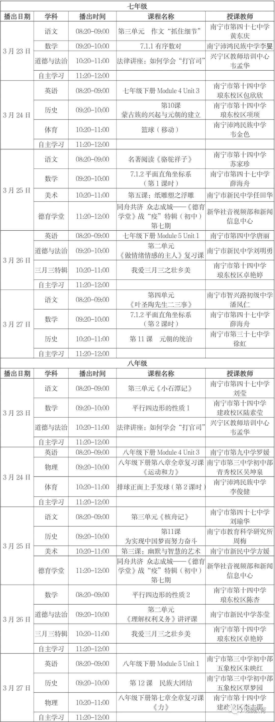 广西中小学“空中课堂”优秀课例播出课程表——初中