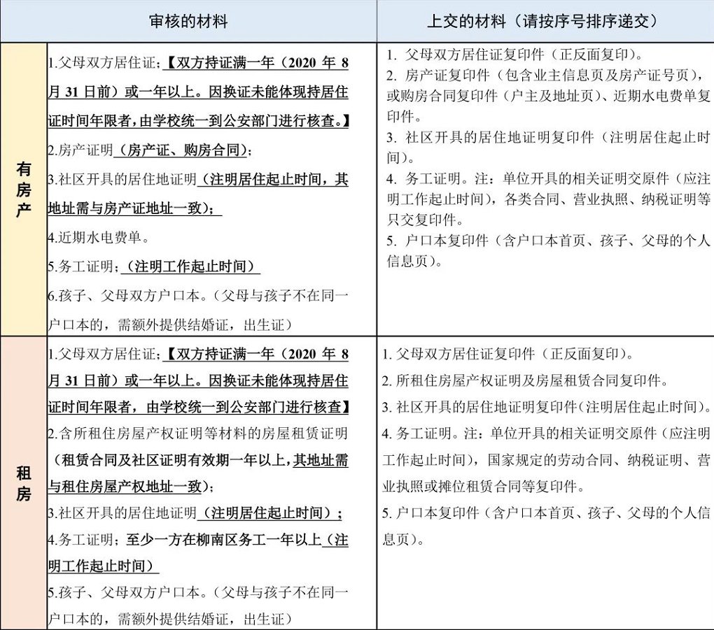 (1)父母双方均持有我校学区范围内柳州市公安部门核发的有效期一年以上居住证(2020年9月1日—2021年8月31日期间的有效居住证)。居住证持有人在居住地连续居住的,应当在居住每满1年之日前1个月内,到居住地公安派出所或者受公安机关委托的社区服务机构办理签注手续。逾期未办理签注手续的,居住证使用功能中止;补办签注手续的,居住证的使用功能恢复,居住证持有人在居住地的居住年限自补办签注手续之日起连续计算。