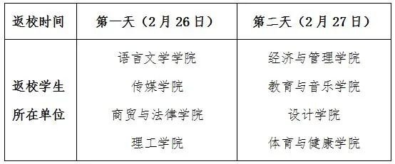 根据学校《关于做好2021-2022学年第一学期期末和寒假工作安排的通知》(桂院政办〔2022〕2号)的文件要求,全体学生于2月26日(星期六)、27日(星期天)报到注册,2月28日(星期一)正式上课。开学各二级学院学生实行错峰返校,具体安排如下: