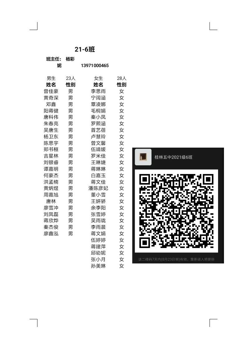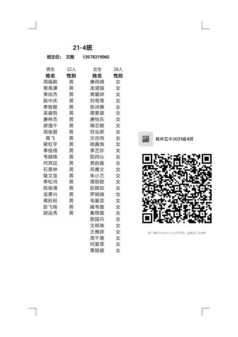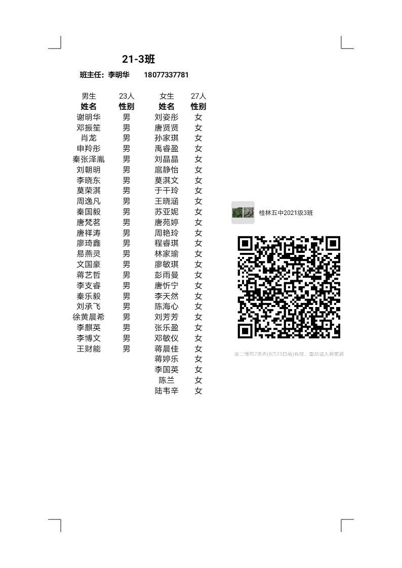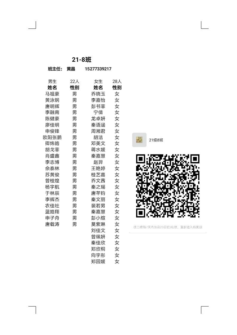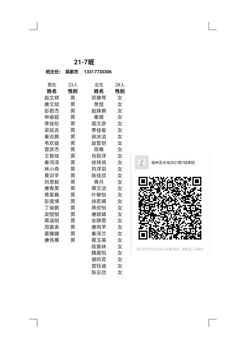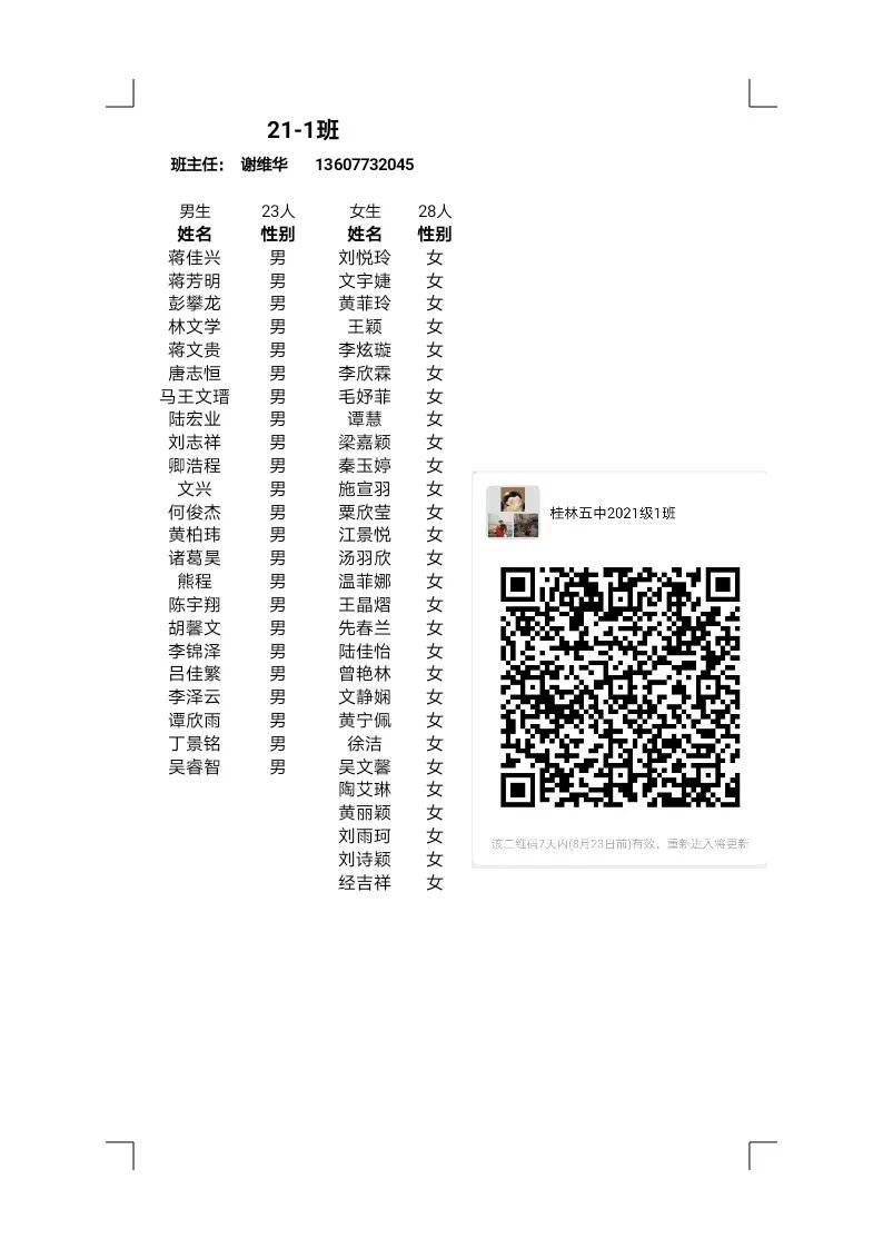 分班情况(请各位家长于今天内扫描后面的班级二维码用学生实名验证入群):
