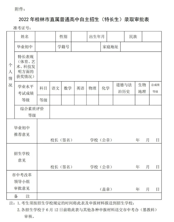 附件:2022年桂林市直属普通高中自主招生(特长生)录取审批表