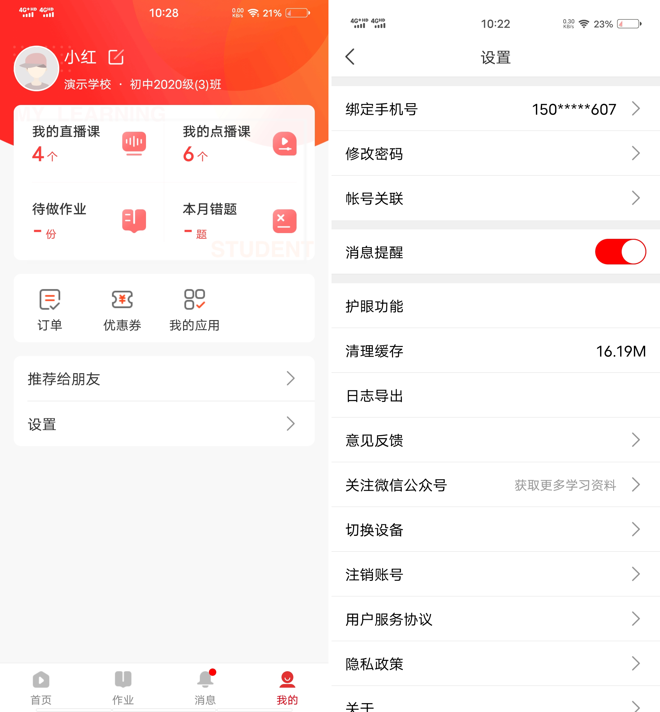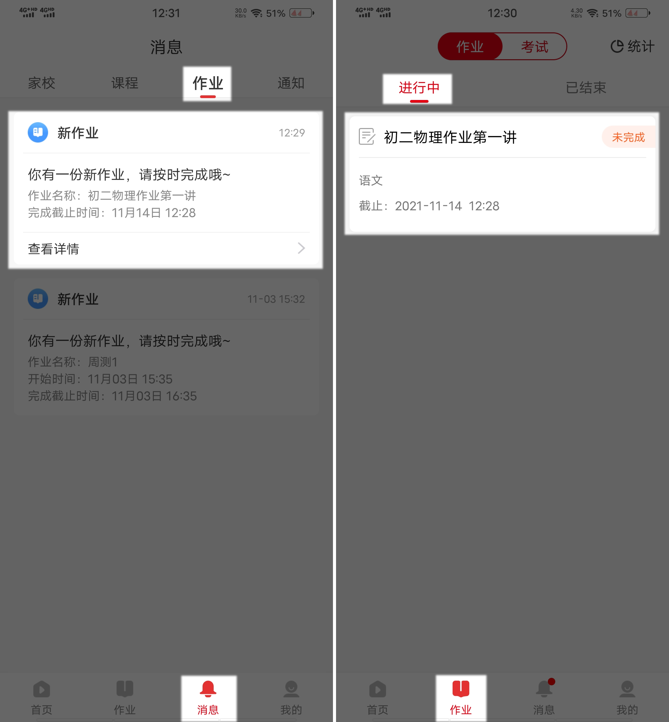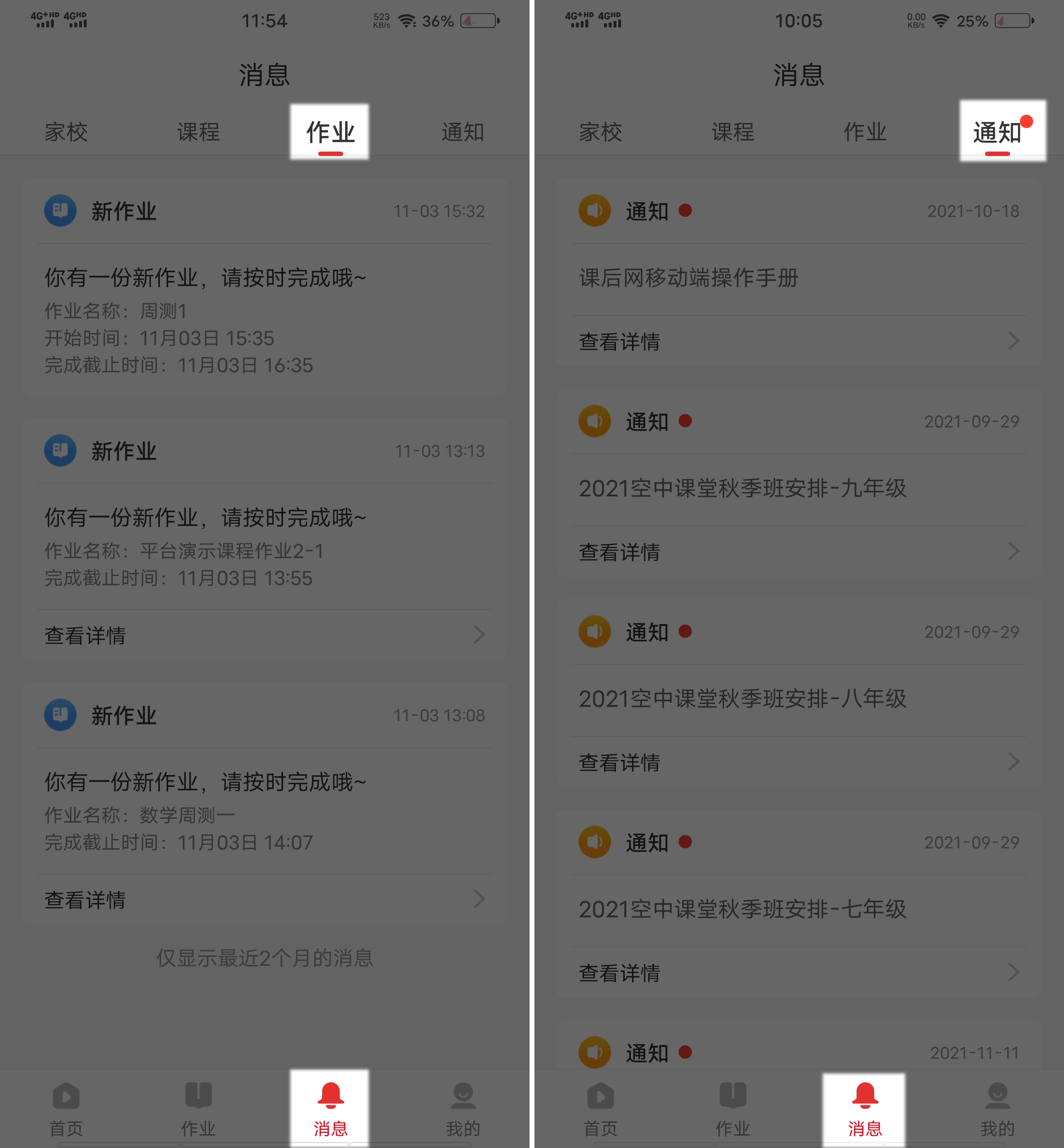 在“作业”栏目课查看待完成及已完成的作业。当教师发布作业、催交作业、完成作业报告时,学生手机课后网APP上会收到相应的消息提醒,学生可在消息中心查看消息,根据消息内容进行作业或订正。