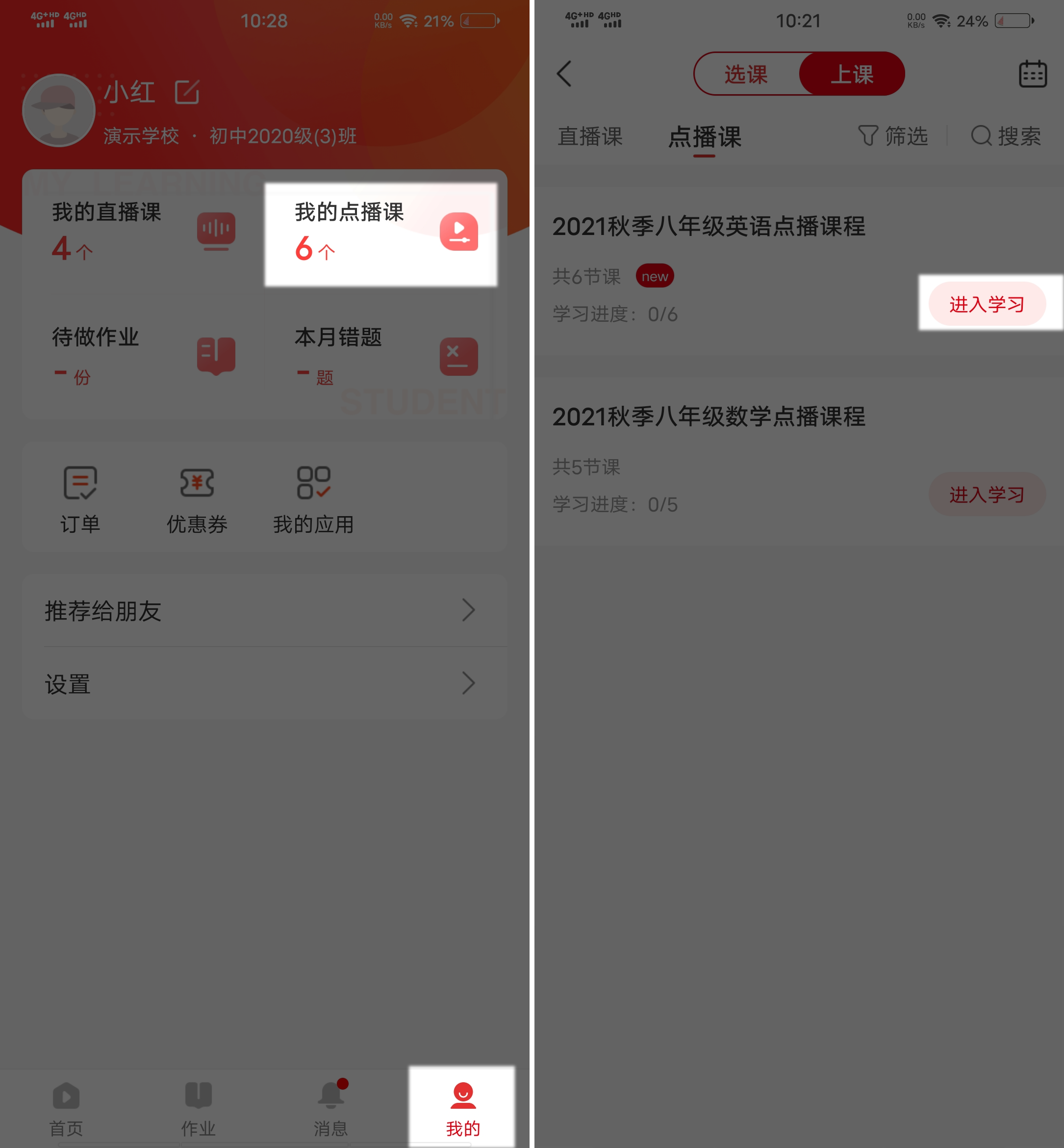 在“我的”栏目点击“我的点播课”,在跳转的页面选择相应的课程点击“进入学习"。选择相应的课次点击右侧的播放按钮即可打开观看。