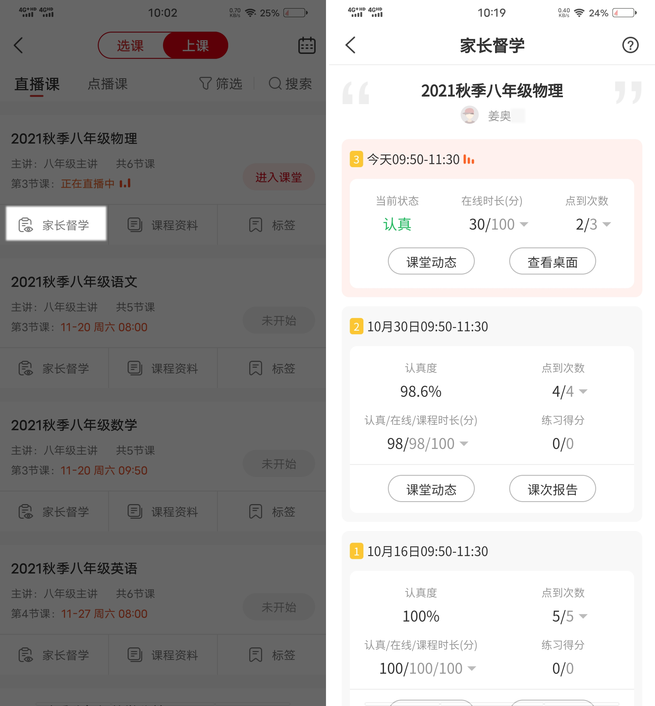 进入直播课列表界面,选择相应的课程并点击“家长督学”,孩子的学习情况即可一目了然。