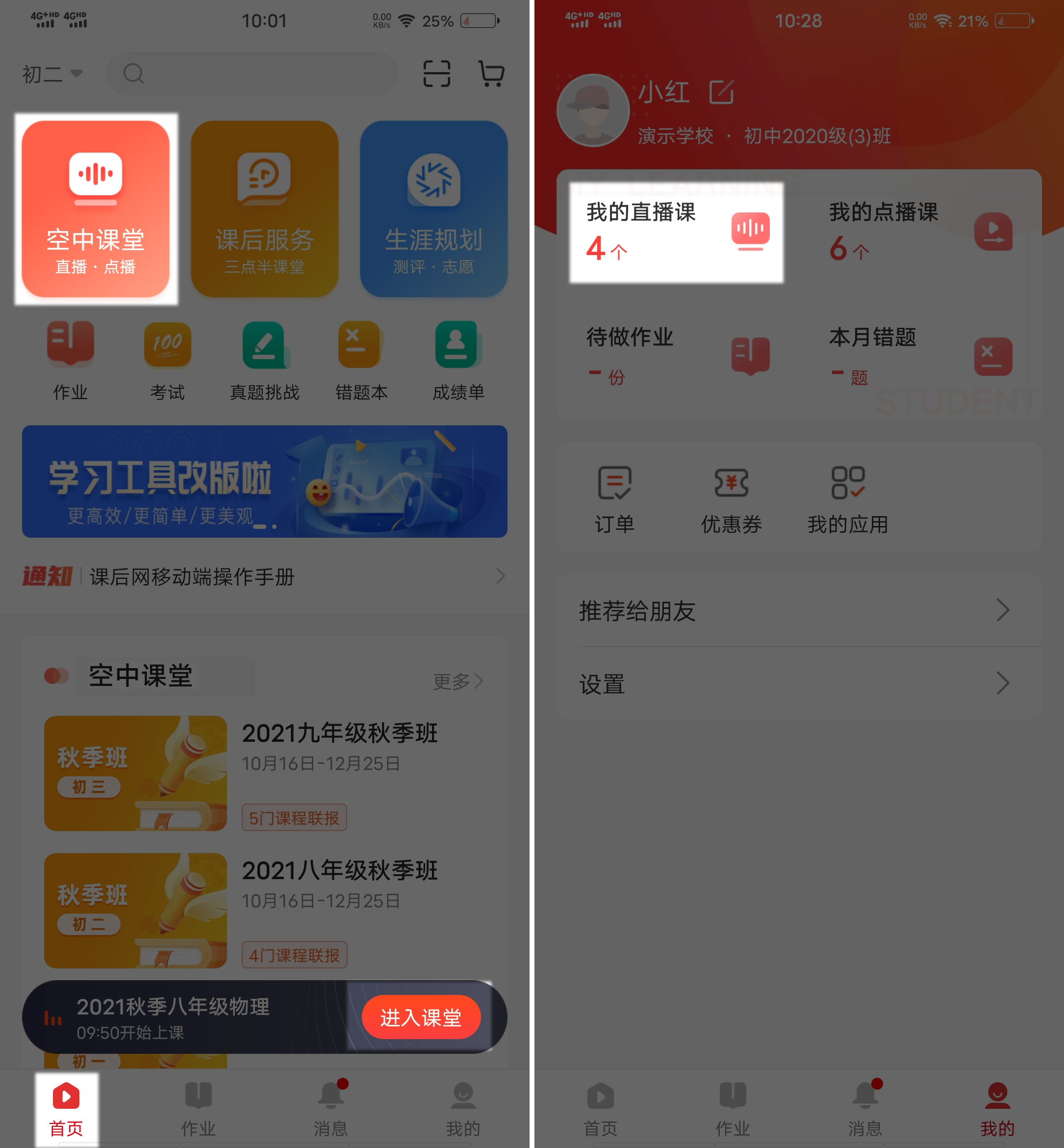 根据课程表时间,可提前30分钟登录,点击底部进入课堂提示或“首页”栏目中的“空中课堂”或点击“我的”栏目中的“我的直播课”进入待上课程,选择相应课程点击“进入课堂”。